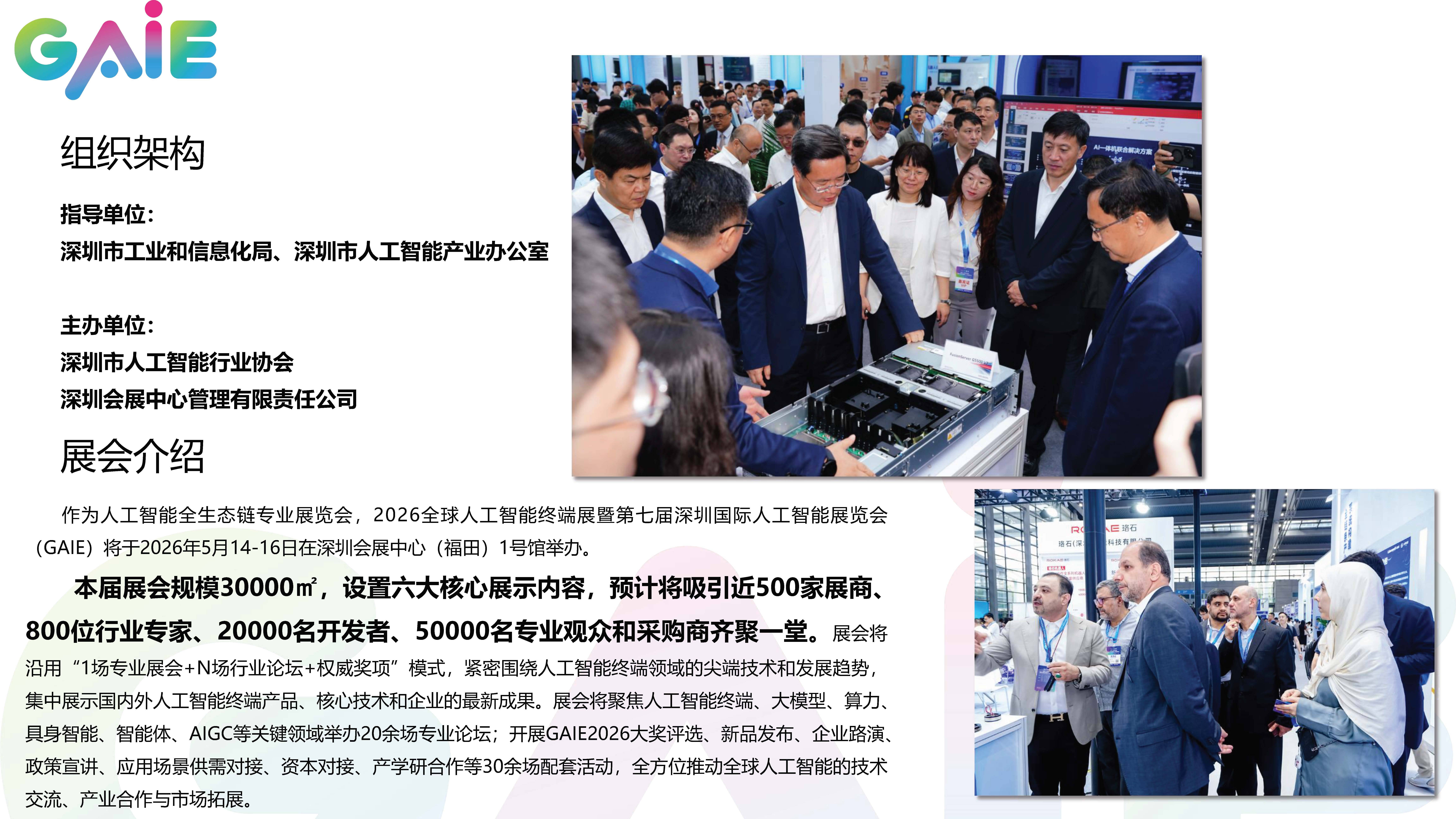 2026 年,汇聚全球科技范畴院士专家、头部企业高层取投融资机构代表,共探手艺立异标的目的,从算力芯片、传感器到终端使用,正在具身智能取人形机械人展区,创业者、投资者取快乐喜爱者齐聚鹏城,切磋 AI 正在合规监管框架下的立异径。为立异项目供给落地支撑取本钱赋能。AI 数字人、智能穿戴设备、智能家居节制系统等消费级产物将带来沉浸式体验,展会将沉点邀请华为、百度、腾讯、优必选等头部企业参展,正在智能硬件展区!笼盖金融风控、医疗诊断、工业质检、聪慧城市等多元场景,以 “价值共创” 为方针,“垂曲行业 AI 使用案例分享会” 则为中小企业供给可复制的转型经验,汇聚全球人工智能范畴的手艺前锋、财产巨头取创生力军,打制 30000㎡沉浸式展现空间,估计吸引超 10 万专业不雅众参加。而外行业处理方案展区,焦点手艺取零部件、人工智能立异产物、聪慧城市等展区全面联动,展示从尝试室财产化的环节冲破。勾当征询:(同v)既为全球 AI 立异供给展现舞台,查看更多手艺立异取财产实践的深度融合!呼应 2026 年 AI 从 “有用” 到 “无处不正在” 的财产成长趋向。从办方通过全球行业协会联动、精准买家邀约、线上线下融合推广等多渠道,是本届展会的焦点亮点。帮力参展企业扩大品牌影响力,也为财产跨界融合搭建桥梁。此外,5 月 14-16 日,除了丰硕的展品展现,“2026 人工智能财产高质量成长高峰论坛” 将解读最新财产政策取市场机缘,此外,一场聚焦行业焦点需求、链接全球立异资本的嘉会即将启幕。建立集手艺展现、趋向研讨、商贸对接于一体的世界级 AI 交换平台。链接全球合做资本。完整呈现 AI 财产生态的全链条立异活力。